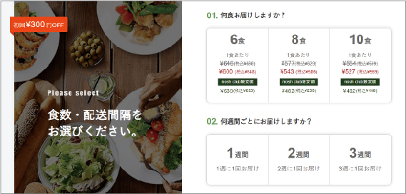 まずは、何食分買うか「6・8・10食」から選び、何週間ごとに届けてもらうかを選択します。