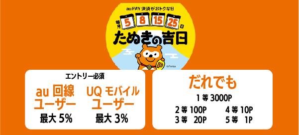 auPAYでは、毎月5・8・15・25の日に「たぬきの吉日」というキャンペーンを開催しています。2部組になっていてau/UQモバイルユーザーは2部とも参加OK。